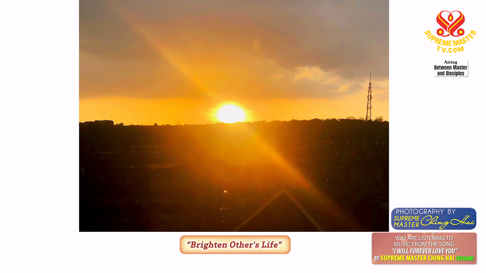 J’aime tout le temps le Soleil, pas seulement ce mois-ci. Mais je veux le montrer une fois. Chaque fois que je prends une photo du Soleil, je Le remercie toujours, et je Lui dis combien Il est beau et combien Il est génial, et combien Il est bénéfique, à quel point Il est un bienfaiteur pour notre planète, comment Il sauve nos vies. Je Le loue toujours et je Le remercie. – Maître Suprême Ching Hai (végane)